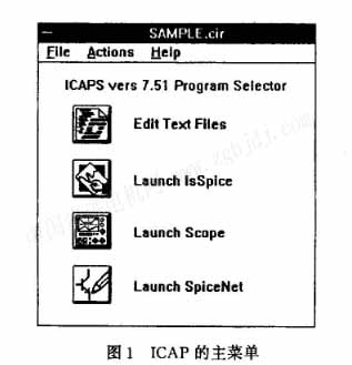 spicenet是icap新開發(fā)的功能強(qiáng)大的電路圖編輯器,在這里用戶可以直接畫電路圖,退出后,icap(主菜單見圖1)會(huì)自動(dòng)形成isspice所需的ckt文件。