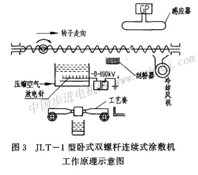 該機(jī)(見圖3)有兩根低速相同方向旋轉(zhuǎn)的長螺桿,轉(zhuǎn)子兩端各裝一個工藝套,當(dāng)螺桿轉(zhuǎn)動時,工藝套與螺桿摩擦隨之轉(zhuǎn)動,并向前推進(jìn),當(dāng)進(jìn)入靜電流化床云霧室時,粉末由于靜電的吸附作用,吸附在轉(zhuǎn)子上,當(dāng)轉(zhuǎn)子前進(jìn)到刷粉工位時,轉(zhuǎn)子外圓和工藝套的粉末被刮粉刷刷掉,再前進(jìn)到固化區(qū),固化區(qū)有兩種,一種是遠(yuǎn)紅外加熱,另一種是高頻感應(yīng)加熱,工件經(jīng)加熱固化后到冷卻區(qū),將轉(zhuǎn)子冷卻即為成品,該機(jī)產(chǎn)量高,轉(zhuǎn)子外圓不需加工藝套,但缺點是對于深槽、厚度較厚的轉(zhuǎn)子不適用。該機(jī)適用于大批量、要求不高的玩具電機(jī)、低電壓尺寸較小、槽數(shù)較小、開口較寬轉(zhuǎn)子的涂敷。