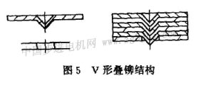 b.v形疊鉚點(diǎn):結(jié)構(gòu)如圖5所示,該疊鉚點(diǎn)的特點(diǎn)是鐵心沖片之間的連接強(qiáng)度大,適用于鐵心密疊式或半密疊式結(jié)構(gòu)。