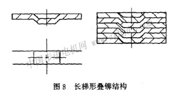 d.梯形疊鉚點(diǎn):圓梯形疊鉚點(diǎn)結(jié)構(gòu),如圖7所示,長梯形疊鉚點(diǎn)結(jié)構(gòu)如圖8所示,兩者都適用于鐵心密疊式結(jié)構(gòu)。