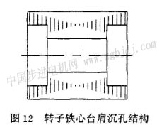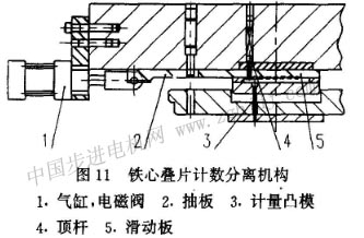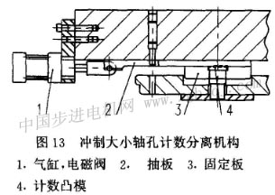 鐵心疊鉚厚度控制方法是,在鐵心預(yù)定的片數(shù)疊完時(shí),把最后一片沖片上的疊鉚點(diǎn)沖穿,使鐵心按預(yù)定的片數(shù)分離,如圖10所示的沖裁疊鉚一個(gè)鐵心完工時(shí)控制分離的情況。在模具結(jié)構(gòu)上設(shè)置有自動(dòng)疊片計(jì)數(shù)分離裝置,如圖11所示,在計(jì)數(shù)凸模上面有一抽板機(jī)構(gòu),抽板由氣缸帶動(dòng),氣缸動(dòng)作由電磁閥控制,電磁閥根據(jù)控制箱發(fā)出的指令而動(dòng)作。因此只要在控制箱上設(shè)定所需要的片數(shù),沖床每一次行程信號都輸入到控制箱里,當(dāng)沖到所設(shè)定片數(shù)時(shí),控制箱會(huì)發(fā)出信號,通過電磁閥和氣缸,使抽板動(dòng)作,從而使計(jì)數(shù)凸模達(dá)到計(jì)數(shù)分離的目的,即在沖片的疊鉚點(diǎn)上達(dá)到計(jì)量l被沖穿和不沖計(jì)量孔的目的,鐵心疊片厚度可自行選擇。有的轉(zhuǎn)子鐵心的軸心孔因支承結(jié)構(gòu)的需要,要求沖制成有2段或3段臺肩沉孔,如圖12所示。轉(zhuǎn)子鐵心,在級進(jìn)模上同時(shí)完成沖制這種有臺肩孔疊鉚要求的工序,可采用上述相類似的結(jié)構(gòu)原理,滿足這一要求,模具結(jié)構(gòu)如囹13所示。 (待續(xù))