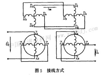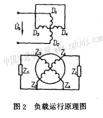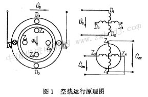 圖2負載運行原理圖理圖。由于加載后會使輸出電壓產(chǎn)生畸變,必須進行補償,將定子d3d4繞組短路為原邊補償,將轉(zhuǎn)子2324繞組接一阻抗zc(且zc -zl)為副邊補償。同時采用原邊補償和副邊補償?shù)男Ч炔捎闷渲腥魏我环N單獨補償都好。
