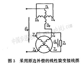線性旋轉(zhuǎn)變壓器是在一定的轉(zhuǎn)角范圍內(nèi),輸出電壓與轉(zhuǎn)子轉(zhuǎn)角成線性關(guān)系的旋轉(zhuǎn)變壓器。圖3為采用了原邊補償?shù)木性旋轉(zhuǎn)圖3采用原邊補償?shù)木性旋變接線圖變壓器的接線圖,其轉(zhuǎn)子的輸出電壓為: