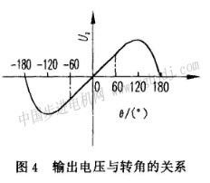 在變比=0. 52時,輸出電壓uz與轉(zhuǎn)角護的關(guān)系如圖4所示。在60度的范圍內(nèi)近似為線性關(guān)系,且誤差不會超過百分之0. 1。上述結(jié)果是在忽略定、轉(zhuǎn)子漏阻抗的情況下得到的。實際的旋轉(zhuǎn)變壓器,為了得到****的線性關(guān)系,取變比=0. 56~0. 57。