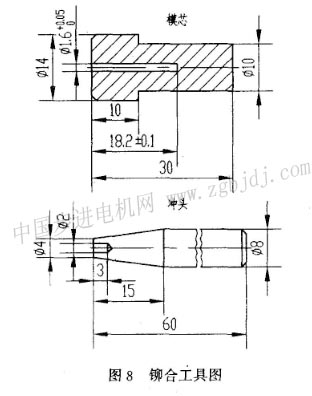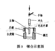 圖2結(jié)構(gòu)的同步電機(jī)會(huì)產(chǎn)生這種故障。故障原因是電機(jī)外罩與主軸鉚合不牢,或者受外力碰撞,使主軸松動(dòng),因而主軸晃動(dòng),轉(zhuǎn)子繞其運(yùn)轉(zhuǎn)時(shí)就要晃動(dòng),與爪極相擦發(fā)出響聲,嚴(yán)重時(shí)轉(zhuǎn)子被卡住不能轉(zhuǎn)動(dòng)。檢修時(shí),首先用45號(hào)鋼按圖8車制沖頭和模芯各一件,工作端部還要經(jīng)熱處理——淬硬。鉚合時(shí),圖8鉚合工具圖將電機(jī)外罩連同其上的主軸放入模芯小孔內(nèi),并且要使主軸末端頂?shù)侥P拘】椎牡撞,并調(diào)整外罩端面,使其完全貼靠到模芯的端面上,再將沖頭垂直地放在外罩與主軸原鉚合位置上,用小鐵錘敲擊沖頭(見(jiàn)圖9),直到鉚牢為止。鉚合過(guò)程中要注意保持主軸與外罩端面的垂直度,不能歪斜,否則電機(jī)將不能運(yùn)轉(zhuǎn)。鉚完后還要檢查是否鉚牢。一手拿住外罩,一手捏住主軸端部,輕輕地?fù)u動(dòng)主軸,若手感主軸無(wú)松動(dòng),說(shuō)明主軸已鉚牢了。最盾,再將電機(jī)組裝好,轉(zhuǎn)子晃動(dòng)現(xiàn)象即可消除。