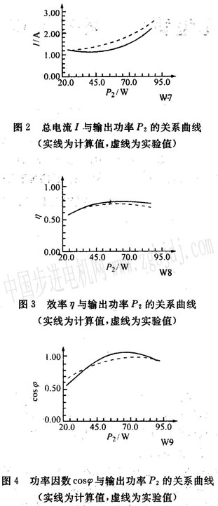 總電流、效率和功率因數(shù)與輸出功率的關(guān)系曲線如圖2~4所示,圖中分別畫出了計(jì)算值與實(shí)驗(yàn)值的曲線。