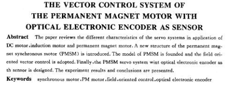摘 要 概述直流電動機、感應電動機、永磁電動機在電動機伺服系統(tǒng)應用中的不同特點,介紹一種新穎的永磁同步電動機結構形式,建立永磁同步電動機的數(shù)學模型,并確立其磁場定向矢量控制方式,設計了以混合式光電碼盤作傳感器的永磁同步電動機伺服系統(tǒng),給出其實驗結果和結論。