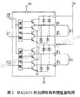 ha13475mp/fp集成電路用于fdd系統(tǒng)的二相全波步進(jìn)電動(dòng)機(jī)的驅(qū)動(dòng),它的內(nèi)部電路原理圖和電機(jī)繞組接線圖如圖2所示。從圖中可以看出它的內(nèi)部主要由兩組邏輯控制電路和全橋功率驅(qū)動(dòng)電路組成,它能提供每相o.33a的輸出電流。芯片具有使能控制,過(guò)溫關(guān)斷(otsd)保護(hù)。它的主要特點(diǎn)是,輸出電壓(4. 5~13. 8v)和電流范圍寬;用一個(gè)輸入端控制電機(jī)的正轉(zhuǎn)/反轉(zhuǎn);輸入端與ttl、lsttl和5-vcmos集成電路兼容ha13475mp為四方扁平mp-18t外形封裝,ha13475fp為雙列直插fp - 16t外形封裝。電路中的輸入端ce、d與輸出端的邏輯關(guān)系如表2所示。