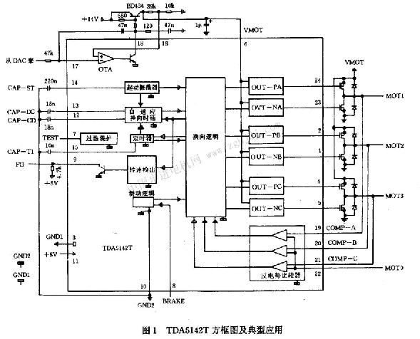 tda5142t的基本原理結(jié)構(gòu)見圖1。圖中主要組成包括換向邏輯、驅(qū)動輸出級、反電勢比較器、獨立放大器,還有起動振蕩器、自適應(yīng)換向時延電路、定時器,它們可由外接電容器整定,此外有一個轉(zhuǎn)速輸出級和一個熱保護電路。