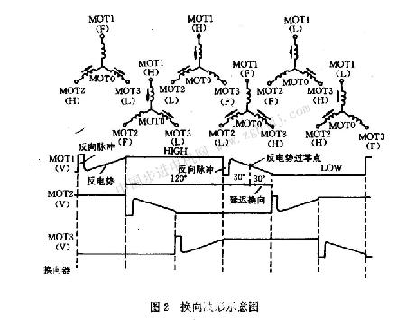 在圖2所示的換向周期內(nèi),全波三相無刷直流電動機三相繞組接至功率級輸出端motl、mot2和mot3,每個輸出有三種可能的狀態(tài),高電壓態(tài),繞組接到電源正端,得到源電流;低電壓態(tài),繞組接到電源低端,得到漏電流;高阻態(tài)。對于一個繞組,高阻態(tài)出現(xiàn)在高態(tài)和低態(tài)之間,此時繞組處于不激勵狀態(tài),繞組反電勢即可由電路中的反電勢比較器檢測,并由換向邏輯選擇。在一個周期內(nèi),三個繞組中必有兩個繞組分別處于高態(tài)或低態(tài),只有一個繞組處于高阻態(tài),它的反電勢過零點被用作轉(zhuǎn)子位置信號供檢測。 要注意的是,反電勢過零點與下一個理想換向時刻相差30。。這個時間間隙由外接cap—cd和cap—dc電容測定和存貯,它們的放電由換向邏輯采樣,以確定予定的換向時延。由換向邏輯選通反電勢比較器確定哪一相電機繞組反電勢的過零點被選用,并用來計算出下一個換向點的正確時刻,由自適應(yīng)換向時延電路按電機負載的大小計算出正確的換向時延。