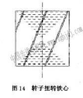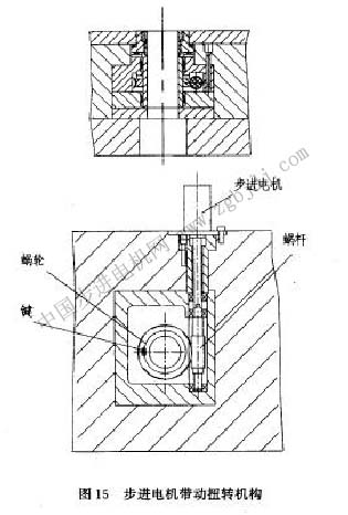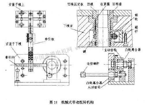 鐵心上每一沖片要旋轉(zhuǎn)一小角度再疊鉚。這種疊鉚方法一般多用于交流電機(jī)轉(zhuǎn)子鐵心上。其沖制過(guò)程是,沖床每沖一次后,模具內(nèi)轉(zhuǎn)子落料部分回轉(zhuǎn)套旋轉(zhuǎn)一個(gè)小角度,旋轉(zhuǎn)量可以改變和調(diào)整。沖片沖下后,鐵心旋轉(zhuǎn),接著被疊鉚在該鐵心上。這樣沖制的鐵心既疊鉚又帶扭轉(zhuǎn),如圖14所示。帶動(dòng)模具內(nèi)轉(zhuǎn)子落料部分回轉(zhuǎn)套轉(zhuǎn)動(dòng)的結(jié)構(gòu)形式有二種:一是由步進(jìn)電機(jī)帶動(dòng)的轉(zhuǎn)動(dòng)結(jié)構(gòu)形式,如圖15所示。二是由模具上模的上下運(yùn)動(dòng)所帶動(dòng)的轉(zhuǎn)動(dòng)(即機(jī)械式扭轉(zhuǎn)機(jī)構(gòu)),如圖16所示。