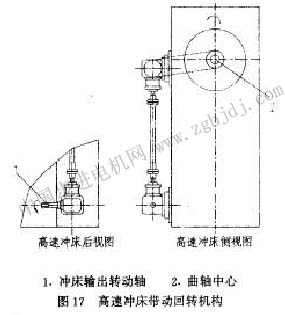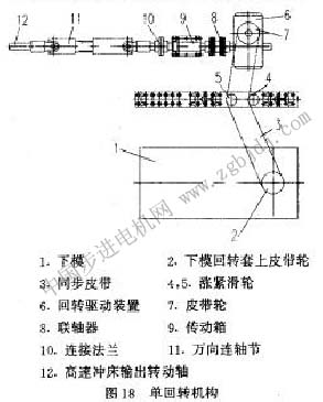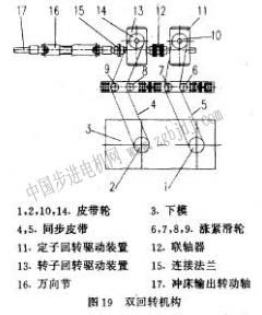 鐵心上每片沖片要轉(zhuǎn)動(dòng)規(guī)定角度(一般為大角度)再疊鉚。其沖制過(guò)程是,沖床每沖一次,模具內(nèi)定、轉(zhuǎn)子沖片落料部分的回轉(zhuǎn)套轉(zhuǎn)動(dòng)規(guī)定角度,每次轉(zhuǎn)動(dòng)的規(guī)定角度要精確。沖片沖下后就被疊鉚在鐵心上,接著鐵心再轉(zhuǎn)動(dòng)規(guī)定的角度。這里回轉(zhuǎn)是以每一沖片的鉚點(diǎn)數(shù)為基礎(chǔ)的沖制過(guò)程。這種疊片方法可以補(bǔ)償鐵心疊片寬度方向的厚度變化。帶動(dòng)模具內(nèi)回轉(zhuǎn)套轉(zhuǎn)動(dòng)的形式采用由高速?zèng)_床曲軸運(yùn)動(dòng)所輸送出來(lái)的轉(zhuǎn)動(dòng),如圖17所示,通過(guò)萬(wàn)向節(jié)、連接法蘭和聯(lián)軸器等分別帶動(dòng)轉(zhuǎn)子回轉(zhuǎn)驅(qū)動(dòng)裝置和定子回轉(zhuǎn)驅(qū)動(dòng)裝置,然后通過(guò)各自驅(qū)動(dòng)裝置的皮帶輪帶動(dòng)同步皮帶,器同步皮帶再帶動(dòng)下模中轉(zhuǎn)子回轉(zhuǎn)套上的皮帶輪和定子回轉(zhuǎn)套上的皮帶輪,最后帶動(dòng)回轉(zhuǎn)套上的轉(zhuǎn)子落料凹模和定子落料凹模轉(zhuǎn)動(dòng)。在模具上回轉(zhuǎn)形式可分為單回轉(zhuǎn)(見(jiàn)圖18) 和雙回轉(zhuǎn)。單回轉(zhuǎn)指轉(zhuǎn)子落料部分回轉(zhuǎn)或者定子落料部分回轉(zhuǎn)的形式,雙回轉(zhuǎn),如圖19所示,即轉(zhuǎn)子落料部分和定子落料部分同時(shí)進(jìn)行回轉(zhuǎn)的形式。定、轉(zhuǎn)子鐵心沖片之間旋轉(zhuǎn)角度是根據(jù)沖片的形狀不同而采用不同的旋轉(zhuǎn)角度,一般有45度、60度、72度、90度、180度等幾種形式。