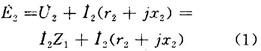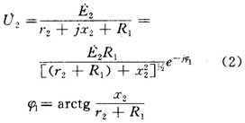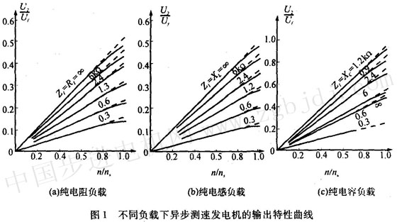 由式(2)、(3)可看出,當(dāng)負(fù)載電阻減小時,輸出電壓也隨之減小,即輸出特性斜率減小,而輸出電壓的相位移將增大,對于電感性和電容性負(fù)載也可進(jìn)行類似的分析。通過分析,并根據(jù)圖1所示的不同負(fù)載下一臺異步測速發(fā)電機(jī)的輸出特性曲線,可得出結(jié)論:①當(dāng)異步測速發(fā)電機(jī)的轉(zhuǎn)速一定,且負(fù)載阻抗值足夠大,則輸出電壓基本不變。②對于純電阻負(fù)載和純電容負(fù)載(當(dāng)負(fù)載容抗x1>x2時),阻抗值改變所引起的輸出電壓的變化趨勢是相反的,因此輸出繞組接以電阻一電容負(fù)載時,有可能調(diào)整到輸出電壓值幾乎不受負(fù)載影響,但不能補(bǔ)償輸出相位移的偏差。③選用電阻~電感負(fù)載,可補(bǔ)償輸出電壓的相漂移,但此時對輸出電壓大小的變化卻無能為力。因此對輸出電壓的大小、相位如何進(jìn)行補(bǔ)償,應(yīng)視系統(tǒng)的要求而定。一般,主要補(bǔ)償負(fù)載改變引起的輸出電壓大小的變化。