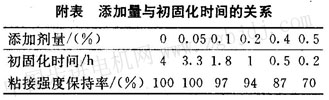 被粘接對(duì)象是若干片狀的磁瓦與圓形轉(zhuǎn)子,要將一片片的磁瓦沿徑向粘貼在圓周面上,難度較大,除了專用夾具外,尚需改善膠的初固化性能,即加快凝膠速度,使其能在短時(shí)間內(nèi)將磁瓦貼附在磁軛上面。由于該膠屬于水溶性,通過(guò)在基料中加入添加劑,在不降低或者對(duì)粘附性能影響較小的前提下,加快凝膠速度。這種添加劑可以是硼酸鹽、氟化物、氟硅酸鹽,亦可以是磷酸鹽;蛘吣z速度雖快,但影響粘接強(qiáng)度較為明顯;后者在一定濃度下對(duì)粘接強(qiáng)度影響的幅度不大,因此,選擇可溶性磷酸鹽作為添加劑。附表是添加量與初固化時(shí)間的關(guān)系,添加量宜控制在0.2%~o.4%之間,既縮短了初固化時(shí)問(wèn),又保持了足夠的粘接強(qiáng)度。