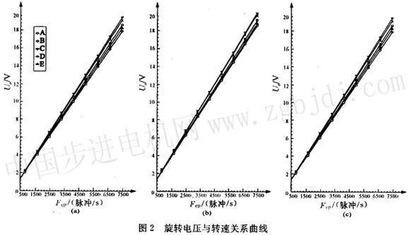 測試結(jié)果表明,依次錯開的角度確實(shí)與電角度72o相差很小,用本測試系統(tǒng)測不出這一誤差,即小于本測試系統(tǒng)的分辨率(若以fcp=500脈沖/s驅(qū)動運(yùn)行于整步,則相電壓周期為20ms,數(shù)據(jù)采集速度為25khz,對二相電壓進(jìn)行隔點(diǎn)采樣,則每周期各自的采集點(diǎn)數(shù)為250,若再進(jìn)行倍密插值,則采樣點(diǎn)可達(dá)500.用求二相電壓過零點(diǎn)采樣點(diǎn)數(shù)之差的辦法即可求相位差,可見測錯開角度的精度約±o.72o),可認(rèn)為相位關(guān)系是對稱的。