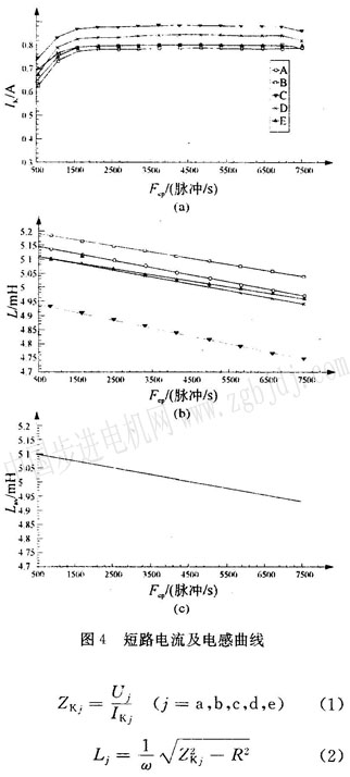 電感與轉(zhuǎn)速的關(guān)系曲線如圖4c所示。當(dāng)然,如果用電動機(jī)的平均旋轉(zhuǎn)電壓及五相短路電流的平均值.直接求出平均等效電感也一樣。