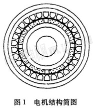 圖1為電機結(jié)構(gòu)簡圖。定子鐵心采用斜槽,繞組為分?jǐn)?shù)槽繞組,可有效地改善電勢波形。轉(zhuǎn)子采用瓦片式稀土磁鋼激磁,這種結(jié)構(gòu)漏磁較小。磁鋼外套護(hù)環(huán),以提高可靠性。