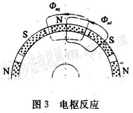 當(dāng)電樞反應(yīng)呈去磁作用時,f ad為正。由式(4)、(5)、(6)知,  磁鋼工作點降低。反之.電樞反應(yīng)呈助磁作用,f ad為負(fù),  磁鋼工作點上升。
