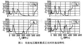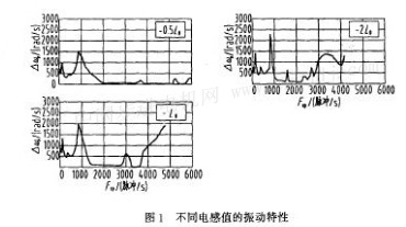 假定繞組電感可以獨立變化,電感不同時仿真的振動特性如圖1所示。曲線表明電感變化對振動特性有顯著的影響:在低頻段,電感變化時諧振點不變,峰值隨電感增大稍有增加,但不明顯;在中頻段,諧振點不變,隨著電感增大諧振區(qū)變窄,峰值增大,但也不明顯;對高頻不穩(wěn)定區(qū)的影響顯著,電感增大時,不穩(wěn)定區(qū)的起始頻率變低,不穩(wěn)定性加劇。曲線清楚表明,電感降到實際值的寺時,在正2 000~6 000脈沖/s范圍內(nèi)幾乎沒有不穩(wěn)定現(xiàn)象,運行很平穩(wěn)。可見電感減小可使高頻不穩(wěn)定區(qū)向更高的頻域移動,與電壓提高的作用類似,而且還不會對中頻段的振蕩產(chǎn)生不利的影響。