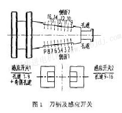 刀柄及感應(yīng)開關(guān)如圖l所示,刀柄側(cè)西1用來表示個(gè)位和十位數(shù),它由1~8孔道和p孔道組成,p孔道為奇偶控制孔道,用來補(bǔ)償編碼螺釘?shù)膫(gè)數(shù),在此編碼螺釘用奇數(shù)個(gè)數(shù)側(cè)面2表示百位和千位數(shù),由9~16孔道組成。