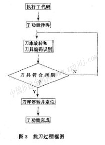 找刀過程框圖見圖3?梢姡业兜年P(guān)鍵在于刀具編碼識(shí)別。一開始,沒有特別注意這一點(diǎn),只是簡(jiǎn)單地將16個(gè)開關(guān)信號(hào)采集進(jìn)來,進(jìn)行判別,但是發(fā)現(xiàn)有時(shí)候找錯(cuò)刀,比如t141找到的可能是t140或t41,甚至tl,經(jīng)過分析,采取措施,便迎刃而解。