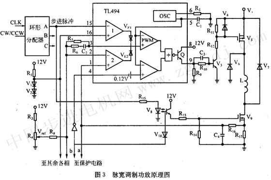 脈寬調(diào)制功放電路見圖3。圖示電路是步進電機一相驅(qū)動器,其余各相均相同。由圖可見,tl494外圍電路很簡單,其中v5、v9分別為p溝道和n溝道功率場效應管,v6、v7為快恢復二極管。采用功率場效應管作為輸出級,一是可有較高的開關頻率。二是fet為電壓型器件,驅(qū)動電路簡單,進一步簡化電路結構。三是安全工作區(qū)不受一次擊穿的限制,驅(qū)動器運動更為可靠。