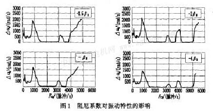 在研究振動特性時,阻尼系數(shù)是一個很重要的參數(shù),阻尼系數(shù)為零或負的系統(tǒng)肯定是不穩(wěn)定的,圖1是電動機空載、本身的阻尼系數(shù)不同的情況下振動特性的仿真曲線。可以看出,阻尼系數(shù)增大時,低頻和中頻振蕩的振幅有所下降,但變化不是十分顯著,對高頻不穩(wěn)定區(qū)則產生明顯的影響。阻尼系數(shù)減小時,高頻不穩(wěn)定區(qū)角速度振蕩的振幅增大,在一定條件下會失步不能運行;阻尼系數(shù)增大,角速度振蕩的振幅減小并趨于穩(wěn)定。加機械阻尼器能改善高頻運行的平穩(wěn)性及提高運行頻域的原因就在于此。