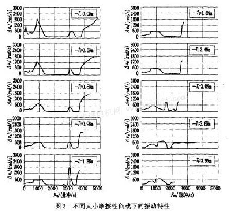 圖2示一系列不同大小的摩擦性負載時振動特性的仿真曲線。可以看出摩擦性負載對低頻振蕩的抑制作用很明顯。低頻諧振時,電動機的角速度一般在正負之間波動,摩擦性負載在角速度改變方向時負載轉矩的方向也改變,因而提供了很強的阻尼作用,所以只要略加負載,角速度的波動都得到了有效的抑制。
