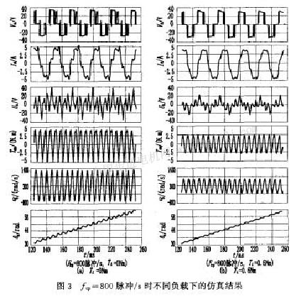 對于中頻段的振蕩,摩擦負載也有較明顯的抑制作用。曲線表明,當負載繼續(xù)增大到tl=0.6nm時,中頻段的振蕩也得到了很好的抑制。此后再進一步增大負載時,對中、低頻段的振動特性影響不明顯,圖3表示fcp=800脈沖/s、tl=o和tl=0.6nm時電壓、電流和角速度等的仿真波形,可以清楚地看出加載后的電流波形、轉矩波形和角速度波形的變化。