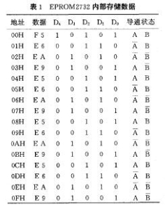 由于16個(gè)導(dǎo)通狀態(tài)中只有一個(gè)狀態(tài)決定是否接收控制信號(hào),因此把eprom2732的輸出端do - d3作為相脈沖信號(hào),d4作為狀態(tài)反饋信號(hào)。相應(yīng)地,其內(nèi)部存儲(chǔ)數(shù)據(jù)如表1所示.