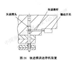 為保證鐵心的疊鉚深度及上模中凸模進(jìn)入到凹模深度,必須使用限位柱進(jìn)行控制,如圖25所示。為防止發(fā)生誤送料故障,設(shè)計(jì)有微動(dòng)開關(guān)進(jìn)行誤送監(jiān)測,如圖26所示。