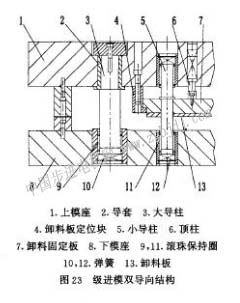 為確保級(jí)進(jìn)模的高精度和制造中工藝要求,一是采用雙導(dǎo)向結(jié)構(gòu),即在上、下模座靠6根大的滾珠導(dǎo)套導(dǎo)向外,另外在各卸料板與上、下模座間有4根小導(dǎo)柱導(dǎo)正,如圖23所示。二是采用較多的鑲拼式結(jié)構(gòu)和組合式結(jié)構(gòu),以保證制造、檢測和維修方便。