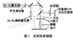 高密度磁盤伺服圖形極坐標(biāo)光刻機(jī)(以下簡稱光刻機(jī))是國家自然科學(xué)重點基金課題“快速超高密度外存儲基礎(chǔ)技術(shù)研究”中的一個子項目,是這個課題中首先要研制成功的一臺高新專用設(shè)備。它要為快速、超大容量外存儲技術(shù)的研究與開發(fā)提供必不可少的物質(zhì)基礎(chǔ),其原理簡圖如圖1所示[1]。