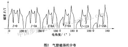 圖2示出了某一額定電流為45a的電機在空載和1~5倍負(fù)載下氣隙磁場沿極距的分布。