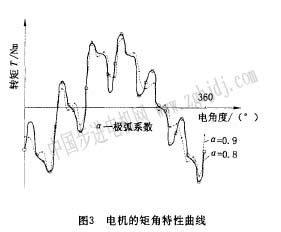 根據(jù)計算結(jié)果,可得到電機的矩角特性[3],圖3給出了極孤系數(shù)分別為0.8和0.9時電機的矩角特性曲線,從中可以看到力矩波動。