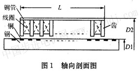 所研究的圓筒型直線感應(yīng)電動(dòng)機(jī)的軸向剖面圖如圖1所示。初級(jí)齒部由硅鋼片疊壓而成,軛部由鋼管做成,槽中嵌以餅式線圈。次級(jí)為車有環(huán)形槽的鋼元,槽中鑲嵌了銅環(huán)。當(dāng)初級(jí)繞組中通人三相電流時(shí),如果固定次級(jí),初級(jí)就會(huì)朝某一方向作直線運(yùn)動(dòng)。試制樣機(jī)的數(shù)據(jù)為: