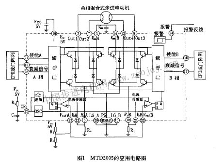 芯片上,因此只要加少許的外圍元件,就能構(gòu)成定電流驅(qū)動(dòng)電路,并且該芯片還具有微步驅(qū)動(dòng)功能,通過切換電流衰減速度可實(shí)現(xiàn)低振動(dòng)、低噪聲的電機(jī)驅(qū)動(dòng)。mtd2005的應(yīng)用電路如圖l所示。