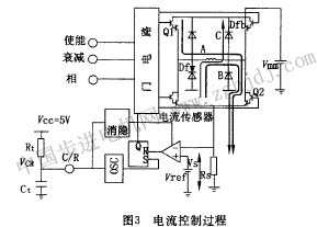 勵(lì)磁信號(hào)使輸出三級(jí)管ql、q2導(dǎo)通。電機(jī)繞組電流的大小被電流檢測(cè)電阻r。檢出,電壓v,逐漸上升,當(dāng)超過基準(zhǔn)電壓y。r時(shí),比較器被觸發(fā),oi關(guān)斷。