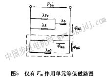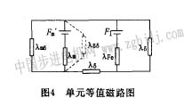 對(duì)應(yīng)于圖1所示爪極永磁步進(jìn)電動(dòng)機(jī)的結(jié)構(gòu),由于其對(duì)稱性,且2個(gè)定子分別組成的磁路又相互獨(dú)立,因此只要研究第一個(gè)定子一對(duì)爪極在內(nèi)的一個(gè)磁單元結(jié)構(gòu)就行了。從圖1中可以看出,經(jīng)過該單元一對(duì)極下半個(gè)極面的單元等值磁路如圖4所示。
