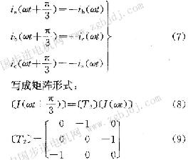 [T2]為電動(dòng)機(jī)電流和電壓相互之間的轉(zhuǎn)換矩陣。也就是說只要能求得電動(dòng)機(jī)任意π/3期間的電流值,就可通過使用轉(zhuǎn)換矩陣[T2],求得整個(gè)周期的解。
