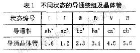 方波激磁時(shí),永磁無刷伺服電動(dòng)機(jī)通常用120。逆變器驅(qū)動(dòng),每一時(shí)刻電動(dòng)機(jī)有兩相繞組導(dǎo)通,每相繞組每次導(dǎo)通120o(電角度),一個(gè)周期分成6個(gè)導(dǎo)通狀態(tài),每個(gè)狀態(tài)持續(xù)60o(電角度),不同狀態(tài)的導(dǎo)通繞組及晶體管如表1所示。