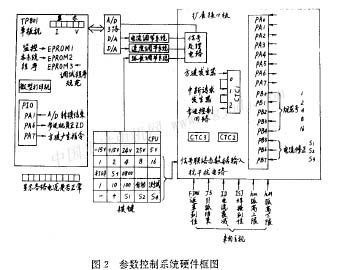 2.5 微機(jī)部分的基本裝置,其主機(jī)由tp -801單板機(jī)、8086cpu、時(shí)鐘主頻2mh、prom三片鍵盤、六位數(shù)碼顯示、接口板、擴(kuò)展接口板、打印機(jī)等組成。參數(shù)控制系統(tǒng)硬件框圖如圖2所示。