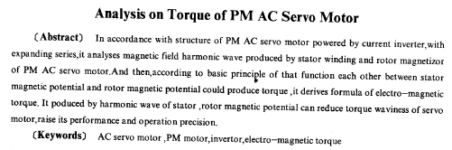 (摘 要) 針對電流型逆變器供電的永磁交流伺服電動機的結(jié)構(gòu),運用級數(shù)展開的方法,對永磁交流伺服電動機定子繞組和轉(zhuǎn)子磁體產(chǎn)生的磁場進行諧波分析;然后根據(jù)定、轉(zhuǎn)子磁勢相互作用產(chǎn)生轉(zhuǎn)矩的基本原理,導(dǎo)出電磁轉(zhuǎn)矩的表達式;指出合理地利用定、轉(zhuǎn)子磁勢諧波產(chǎn)生的轉(zhuǎn)矩,能減少伺服電動機的力矩波動,提高其性能和運行精度。