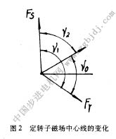 由于逆變器采用橋式供電,故電機一個運行狀態(tài)為60度電角度,在每個運行狀態(tài)中,力矩變化均相同,因此只要分析電機在某一狀態(tài)角范圍內(nèi)的力矩變化即可。假定定、轉(zhuǎn)子磁勢之間的夾角為y,在某一運行狀態(tài)下,定子磁勢的空間位置固定不變,(如圖2)圖2定轉(zhuǎn)子磁場中心線的變化所示)。