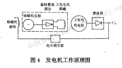 主發(fā)電機(jī)勵(lì)磁。電機(jī)中的勵(lì)磁機(jī)電樞、旋轉(zhuǎn)整流器與發(fā)電機(jī)的轉(zhuǎn)子同軸旋轉(zhuǎn)。發(fā)電機(jī)工作