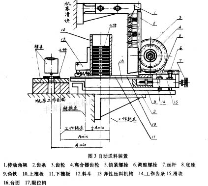 工作齒條與滑塊連為一體,滑塊與推板面可調(diào)性連接。當(dāng)滑塊作進(jìn)給運(yùn)動(dòng)時(shí),上推扳將料斗內(nèi)的工件(其中一件)推出,并在彈性壓料機(jī)構(gòu)的作用下,使工件進(jìn)入轉(zhuǎn)換點(diǎn)(處)。然后在滑塊作第二次進(jìn)給運(yùn)動(dòng)時(shí),下推板將在轉(zhuǎn)換點(diǎn)(處)的工件推入模具中心,而上推板再次把工件推入轉(zhuǎn)換點(diǎn)(處)。這樣達(dá)到對(duì)工件連續(xù)不斷的送料。