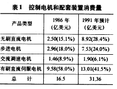 據(jù)統(tǒng)計,1986年在美國市場所有的控制電機中,有刷直流伺服電機占有百分之58的市場份額,無刷直流電機僅占百分之15.1,但由于對傳動產(chǎn)品的需求不斷增加,而電子設(shè)備的成本又在不斷降低,給有刷直流伺服電機銷售帶來一定影響,1991年它的市場份額將降低至百分41.5之即把步進電機和交流調(diào)速電機都包括在其中)在1991年將占到整個市場份額的百分之58以上。表1為美國控制電機和配套裝置的市場消費量。