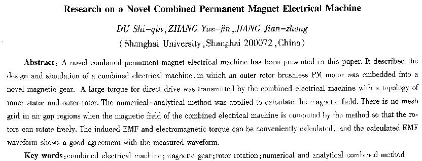 摘要:永磁無刷電機(jī)內(nèi)嵌到同心式磁性齒輪中,形成新型永磁復(fù)合電機(jī)。電機(jī)為內(nèi)定子外轉(zhuǎn)子結(jié)構(gòu),外轉(zhuǎn)子輸出低速大轉(zhuǎn)矩,適合直接驅(qū)動。采用數(shù)值解析結(jié)合法計算復(fù)合電機(jī)磁場,電機(jī)三層氣隙區(qū)域無網(wǎng)格剖分,內(nèi)外轉(zhuǎn)子可自由轉(zhuǎn)動,方便感應(yīng)電動勢計算。電動勢計算波形和實驗波形比較,取得很好的一致。