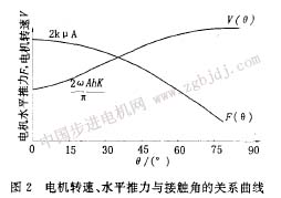 由式(2)、(3)、(4)可以得出電機(jī)的水平推力、轉(zhuǎn)速與接觸角的關(guān)系曲線(xiàn),如圖2所示。