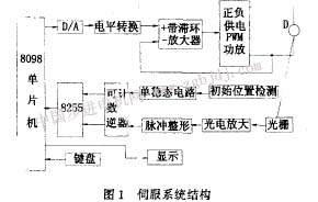 伺服系統(tǒng)結(jié)構(gòu)如圖1所示。主要有4部分組成,即8098單片機(jī),pwm功放及控制電路,光柵及位移檢測電路,鍵盤及顯示電路。